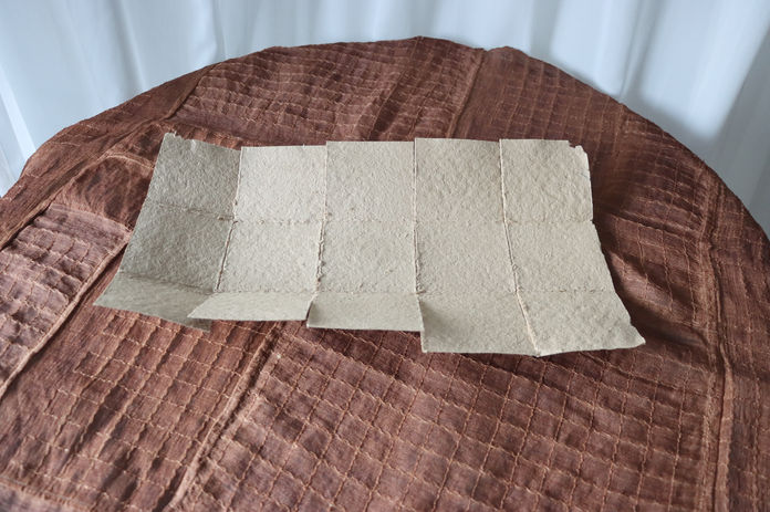 紙はできるだけ糊付けなどの加工を行わないよう、切り込みを入れた部分を折って重ねていくことだけで成り立つ構造になっている。両側が4枚重ねになることで運搬に対する強度もある。紙を漉く道具である木枠は、このパッケージのサイズに合わせて制作したため、仕立てる際に切り落とす部分はほとんどない。