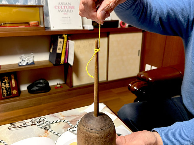 「独楽撚り」は、米沢藩では「づんぐり」と呼ばれ下級武士の仕事だったとの記録があります。現在では、和楽器弦を撚るために滋賀県の丸三ハシモトさんが行っているのが唯一のものです。